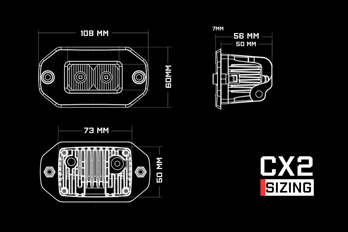 Most LED work lights replicate of a mini driving light beam, a relative flood output with a short distance spot. A generic output whilst often useful has compromised flood intensity for the gain of minimal distance. The CX2 Flush Mount provides an ultra wide flood without bright or dead spot compromise. A game changer for those working in the darkest conditions.