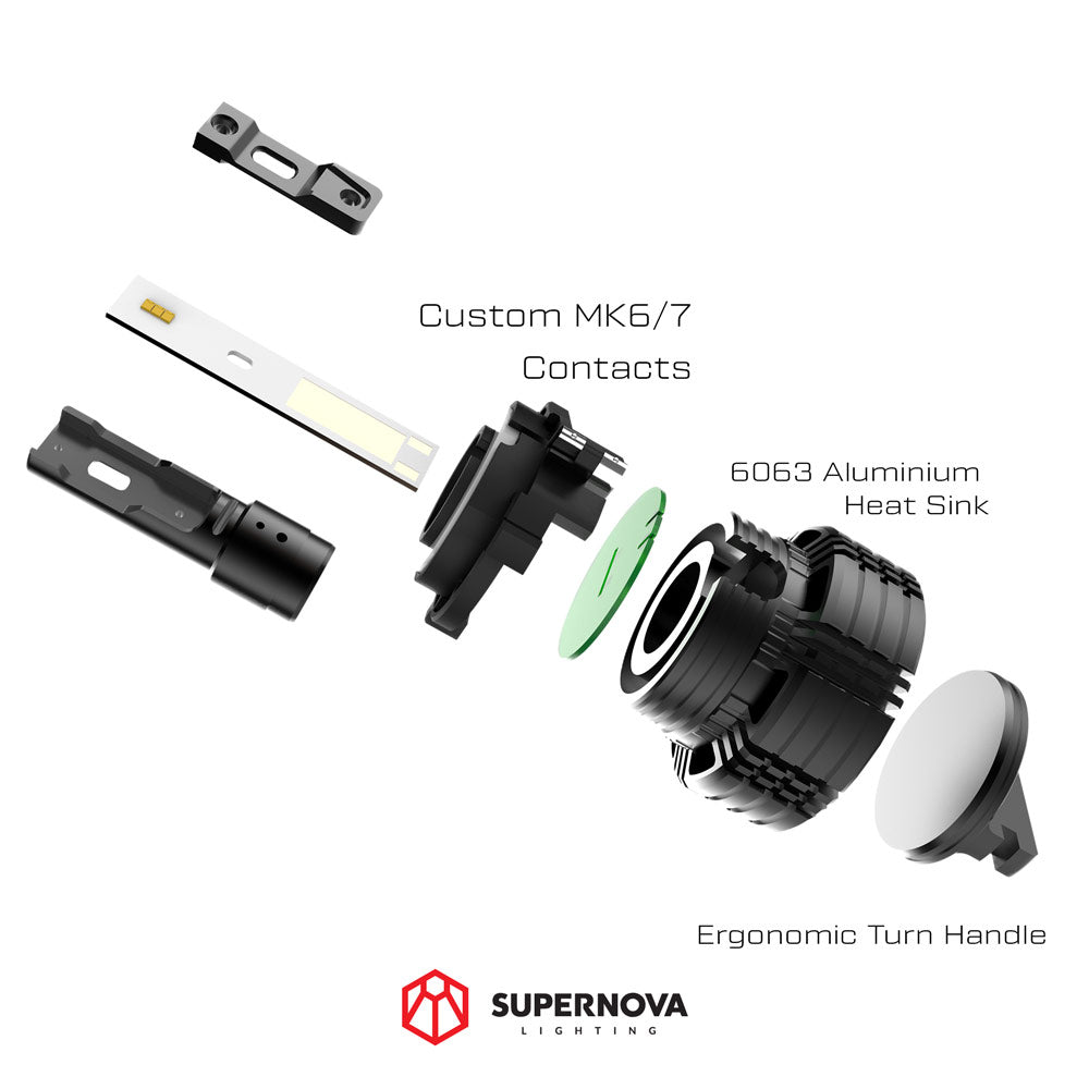 The Golf 6 & 7 deliver great features across the platform yet the headlights are one of the key areas which leave a lot to be desired, both in aesthetics and performance. Whilst the low beam globe is a common H7 socket size, upgrading to LED proves very troublesome as the factory headlight utilises a uniquely specific plastic globe adaptor which only fits halogen globes. Installing H7 LEDs traditionally would require a Golf specific LED adaptor and internal re wiring which was measured over hours. The adaptor would induce a varying amount of play where millimetres of movement can translate to unusable and glaring output patterns. Today we deliver a bespoke LED kit specific for Golf 6 and 7 reflector headlights. With a custom moulded adaptor base and contacts it's a direct fit with install time measured in seconds or minutes (depending on engine bay clearance/rear headlight access of sub model Golf).